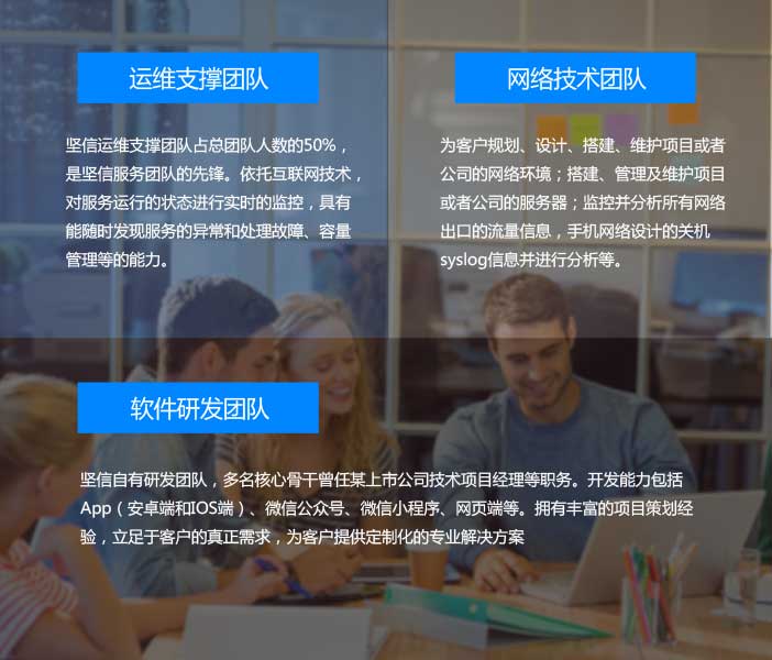 坚信核心团队由三个子核心团队组成,包换运维支撑团队、网络技术团队、软件研发团队。